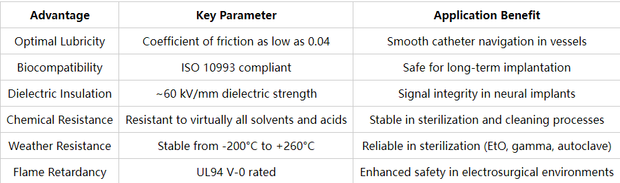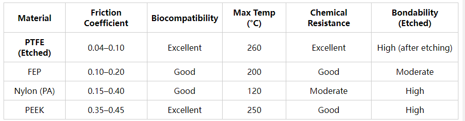 聚四氟乙烯结合了最低的摩擦系数和最广泛的耐化学性,加上蚀刻后获得的粘合能力,使其成为导管内衬的首选材料——尤其在导丝性能至关重要的复杂微创手术中。